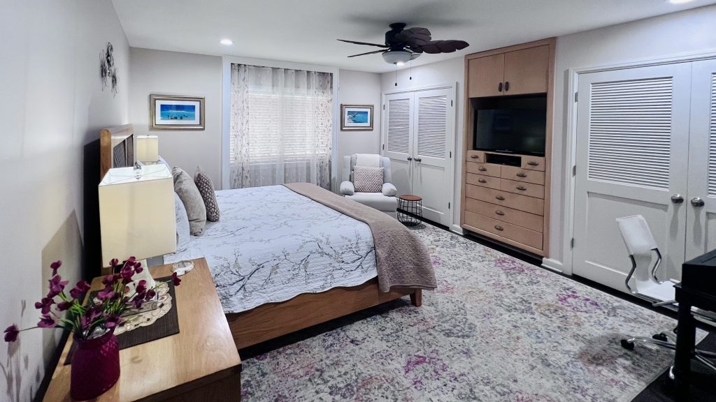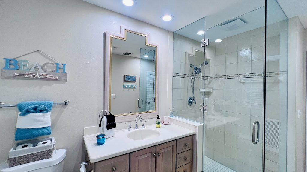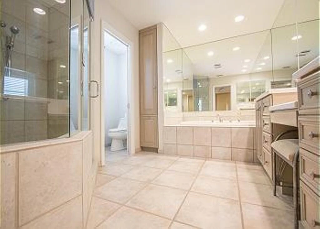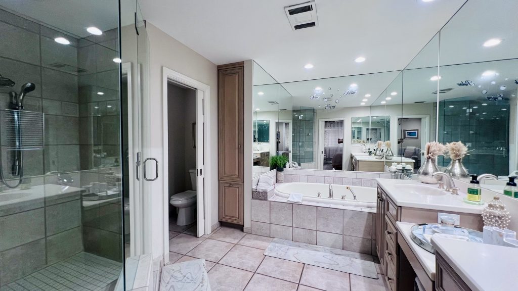 Master Suite Retreat Unwind in the spacious master bedroom with its spa-like bathroom featuring a whirlpool tub, double vanity, and an all-glass shower with built-in bench seating – pure luxury after long beach days.